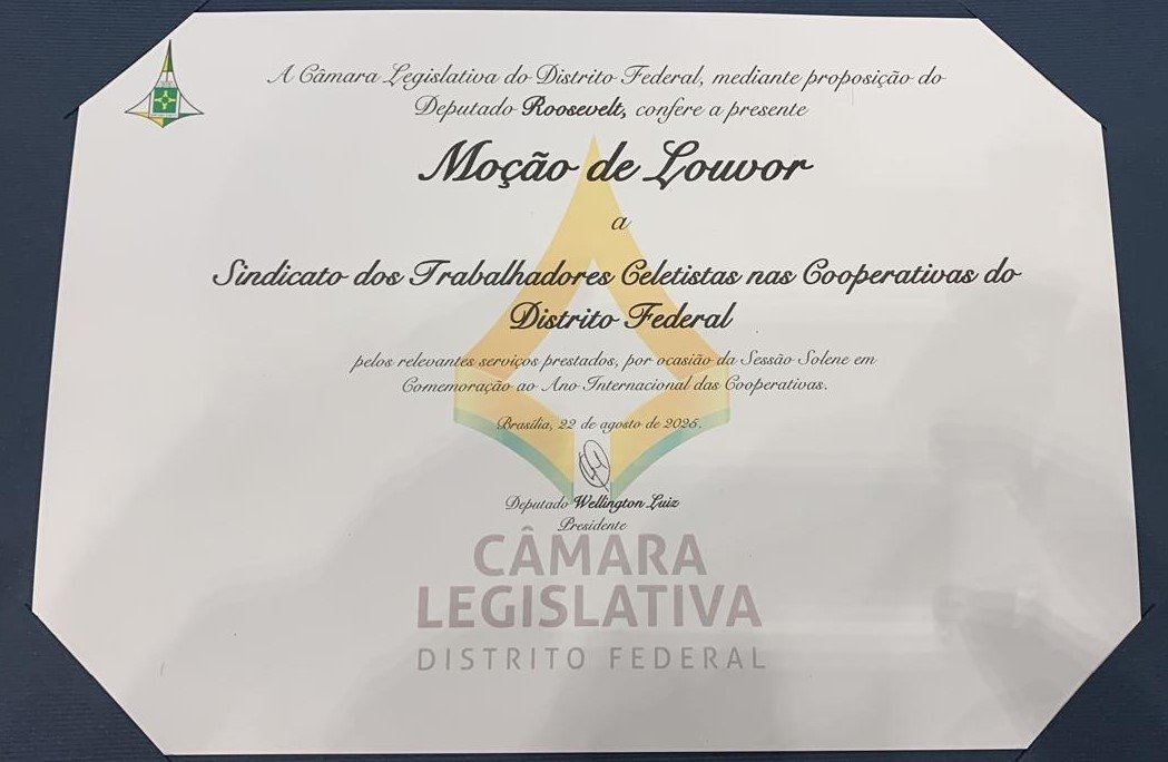 Em reconhecimento à sua contribuição para o fortalecimento do cooperativismo no Distrito Federal, o Sintracoop-DF foi homenageado com uma Moção de Louvor durante sessão solene realizada na Câmara Legislativa do Distrito Federal (CLDF) no dia 22 de agosto e que reuniu lideranças do setor, representantes políticos e trabalhadores, reforçando a relevância do cooperativismo para a economia local e para a construção de uma sociedade mais colaborativa.